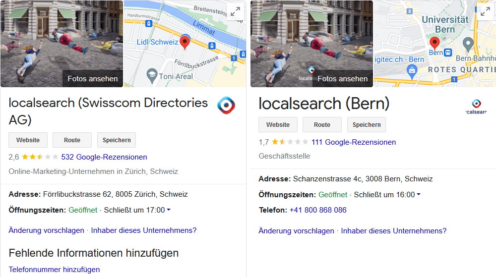 Localsearch hat ein Problem mit den Kunden-Bewertungen im Internet. Auf Google können Userinnen und User ihre Erfahrungen mit der Swisscom-Tochterfirma und deren Produkten anhand einer 5-Sterne-Skala bewerten. Derzeit liegt die Note im Schnitt bei schlechten 2,6 Sternen.